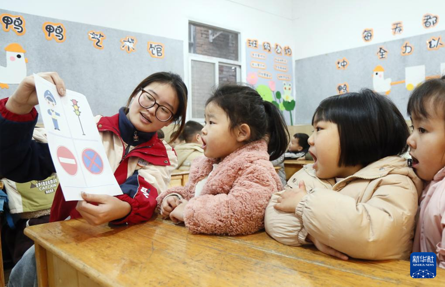 12月1日,河南省洛陽市汝陽縣建橋幼兒園老師教小朋友們識別交通安全標識牌。(新華社發 康紅軍/攝)