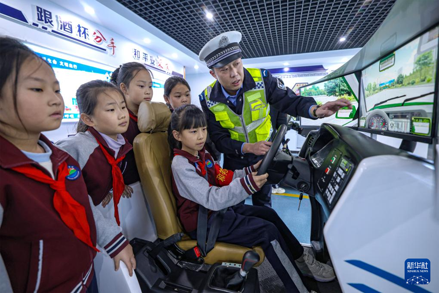 12月1日,在山東省榮成市公安局道路交通安全宣傳教育基地,學生們在體驗模擬駕駛。(新華社發 李信君/攝)