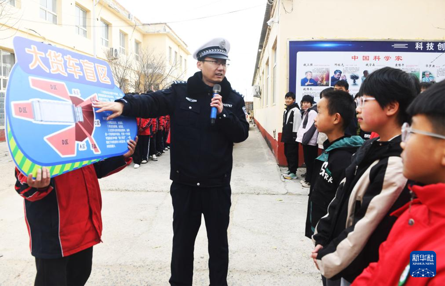12月1日,在河北省石家莊新樂市化皮學校,民警給學生普及交通避險知識。(新華社發 賈敏杰/攝)