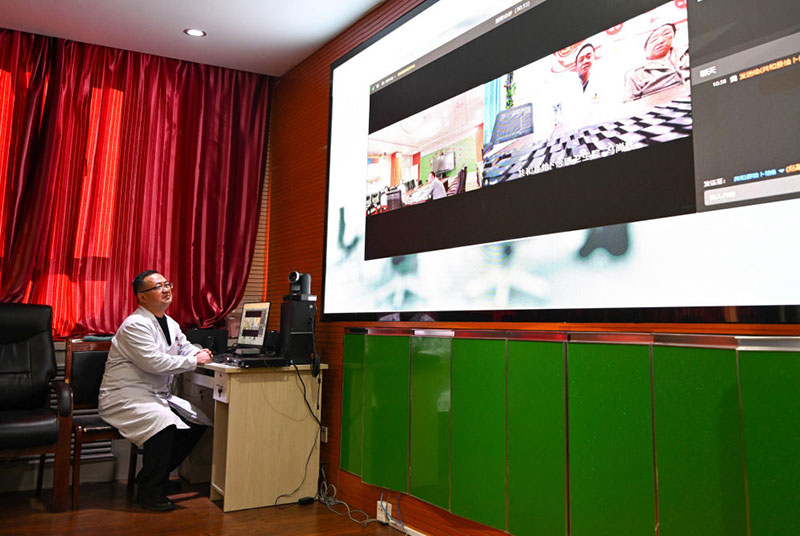 2024年12月17日,在青海省海南藏族自治州共和縣中醫院,醫生與鄉鎮衛生院連線進行遠程會診。(新華社記者 張龍/攝)
