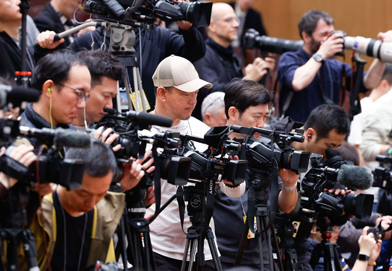 2025年3月10日,全國政協十四屆三次會議在北京人民大會堂舉行閉幕會。這是記者在會場采訪。(新華社記者 張玉薇/攝)