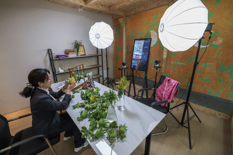 ??在浙江金華市金東區赤松鎮北山口村的金華佛手農林服務中心內的直播間,工作人員進行佛手鮮果及衍生產品的直播銷售(2025年10月22日攝)。(新華社記者 徐昱/攝)