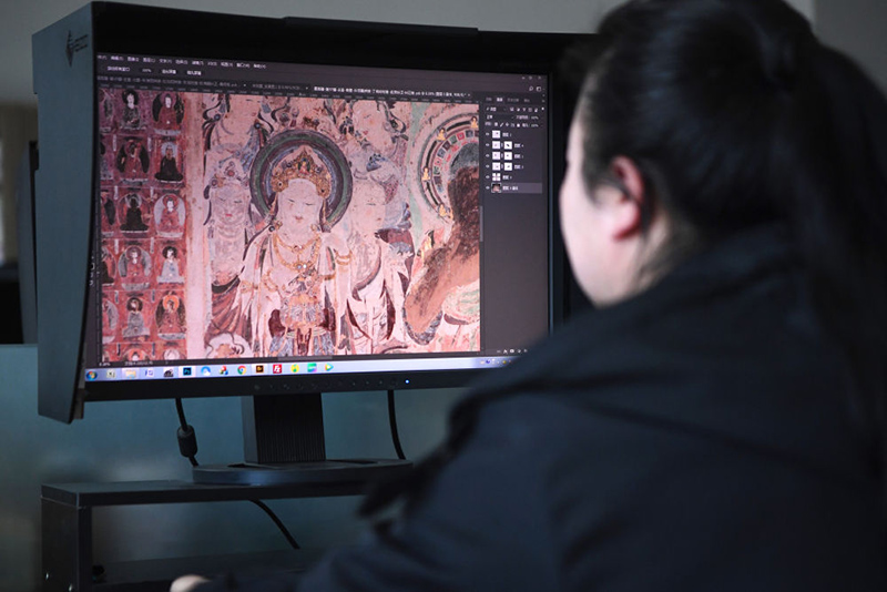 敦煌研究院文物數字化保護團隊圖像處理人員年海麗在拼接壁畫圖像(2023年4月25日攝)。數字化探索為莫高窟的保護與傳承開辟了全新路徑,數字技術讓敦煌文物走出洞窟,跨出國門,走向“永久保存、永續利用”。(新華社記者 陳斌/攝)