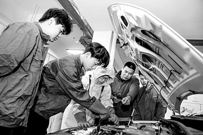 江西省輕工業高級技工學校新能源汽車運用與維修專業學生在老師的指導下學習新能源汽車電池故障診斷技術要領。(周亮攝/光明圖片)