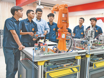 泰國魯班工坊學生參加自動化生產線實訓。(本報記者 孫廣勇/攝)