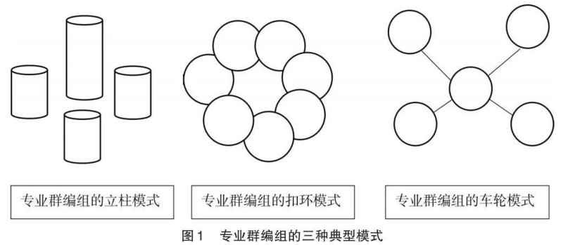當然,由于本科教育與高職教育專業群組建的目的不同,因而它們對知識的邏輯要求也有所不同。本科教育組建專業群的主要目的是促進學術知識的生產,因此其更多地從科學研究突破的角度尋求專業群編組的知識邏輯;高職教育組建專業群的主要目的是促進技能型人才培養,因此它更多地應從復合型應用人才培養的角度尋求知識邏輯。職業類別的多樣化決定了高職教育專業群編組需要采取不同模式,常見模式有立柱模式、扣環模式和車輪模式。立柱模式的特點是群內有一個作為支柱的專業,其他專業依附它而發展;扣環模式的特點是群內各專業之間是交叉、并列關系,沒有哪個專業能發揮絕對的支柱或中心作用;車輪模式的特點是群內有一個居于中心地位的專業,但它與群內其他專業之間的關系是平面的(見圖1)。